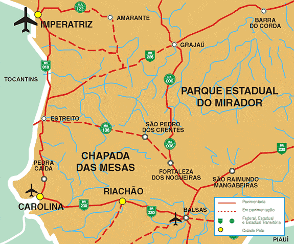 La Chapada das Mesas doit son nom aux hautes collines dont la surface a été aplatie par l’érosion, la plupart d’entre elles ayant la forme d’une table. Son attrait touristique réside dans le tourisme écologique, avec ses beaux paysages végétalisés, ses plages du fleuve Tocantins, ses chutes d’eau et ses chapadões.
