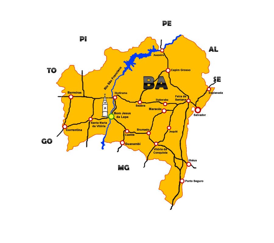 - Ville de Bom Jesus da Lapa : avec ses 65 000 habitants, la ville est célèbre pour son pèlerinage annuel qui attire des milliers de fidèles. La ville s’est développée autour du sanctuaire et est devenue un village en 1870, puis une ville en 1923.