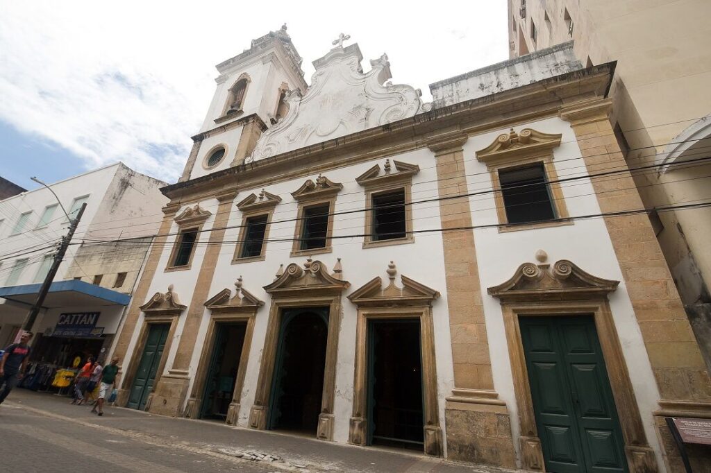 La façade, simple et dotée d’un seul clocher, passe presque inaperçue au milieu des lumières de l’une des rues commerçantes les plus animées de Recife.