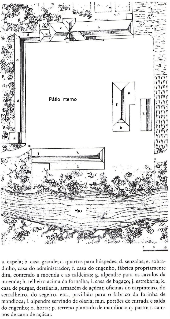 Selon les écrits de l’ingénieur français Vauthier, qui a vécu à Pernambouc entre 1840 et 1846, les sucreries de Pernambouc de cette époque avaient leurs bâtiments répartis sur le terrain de manière à limiter de façon discontinue une cour intérieure rectangulaire.