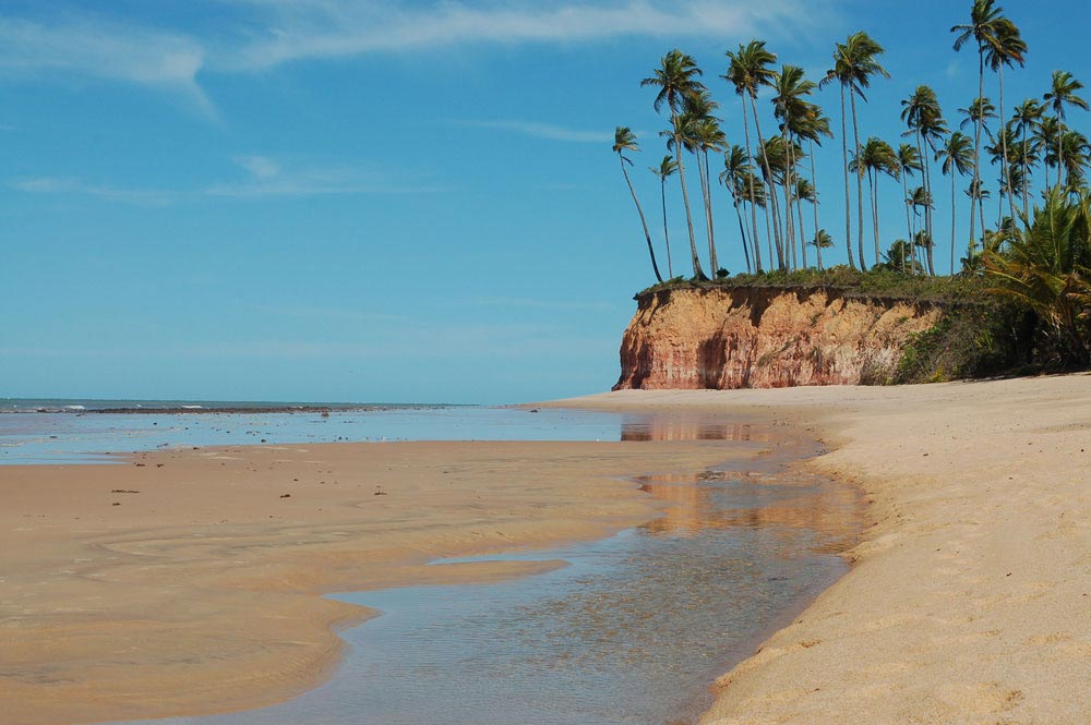 La plage de Barra do Cahy, sur la côte sud de Bahia, a des eaux claires et se jette dans une rivière. On y trouve également de grandes falaises et de nombreux cocotiers.