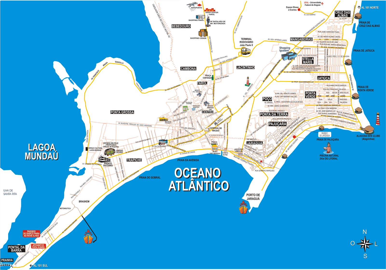 Parmi les plages urbaines, les plus populaires et les plus belles sont celles de Ponta Verde (à 5 km du centre-ville) et de Jatiúca (à 6 km du centre-ville).