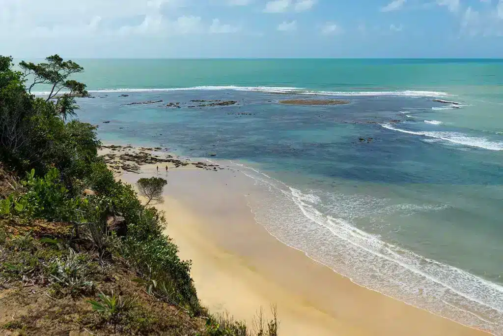 Considerada uma das praias mais bonitas do Brasil, possui piscinas naturais, falésias coloridas e recifes, além de rios que desembocam no mar, formando um cenário único.