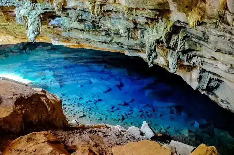 Lago de águas transparentes e azuladas formadas pelo subterrâneo da Gruta da Pratinha.