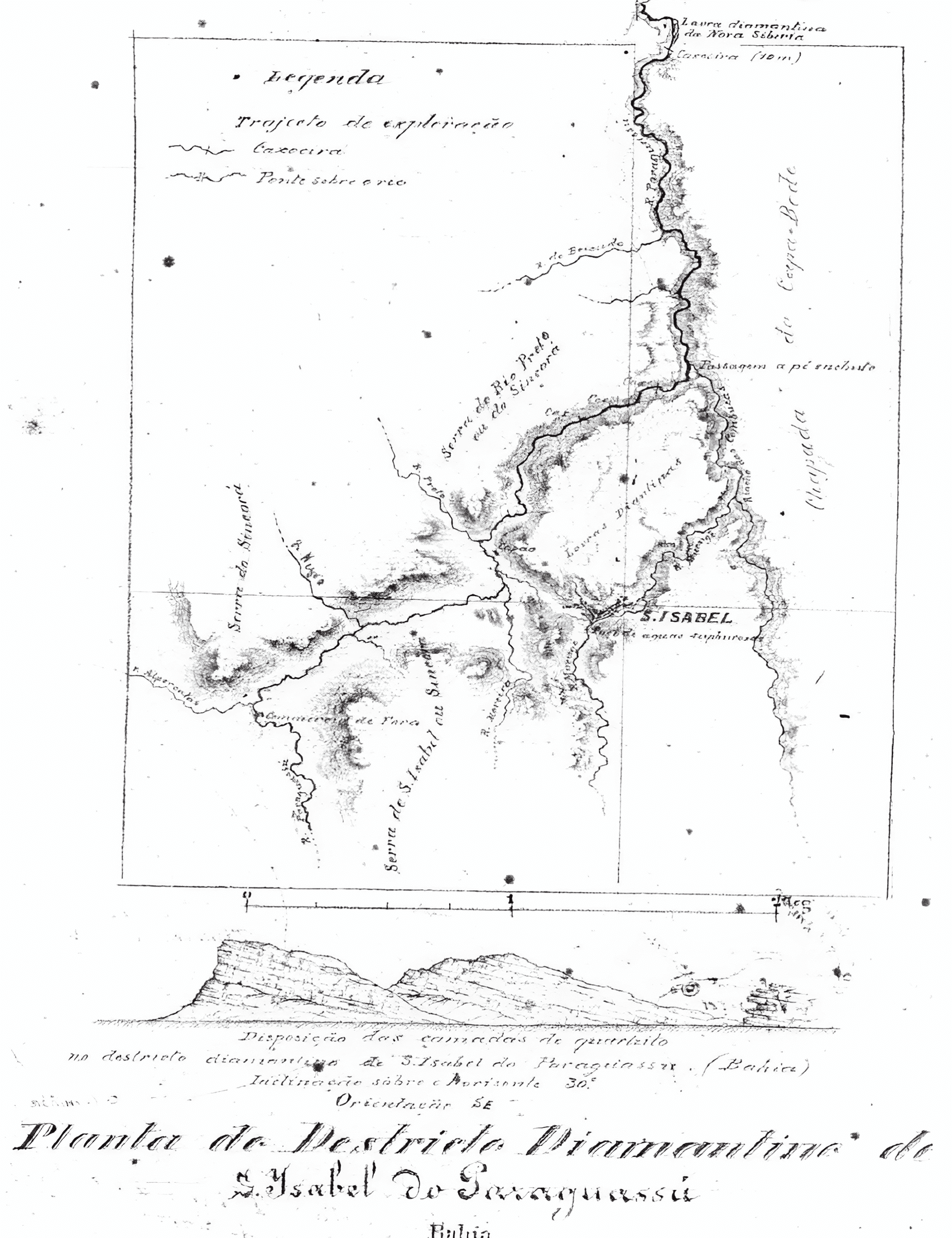 Na Figura 11 é apresentada a Planta do Distrito Diamantino de S. Isabel do Paraguassú, também elaborada por Theodoro Sampaio. Nesse ambiente estavam alocadas as lavras diamantinas e na planta são localizados os caminhos que eram seguidos para o acesso a essas vilas. Sampaio demarca os caminhos por meio da sinalização das cachoeiras e pontes construídas sobre os rios do território, cortando os afluentes do Rio Negro e o Rio Preto do Sincorá.