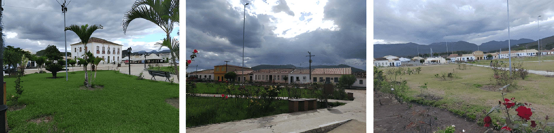 Figuras 3, 4 e 5. Conjunto de moradias pertencentes ao sítio urbano tombado em Rio de Contas – BA, 2022. Fotos: Letícia Coêlho de Oliveira. “Nessa escala, nota-se uma conformação típica do período colonial em que as ruas, os quarteirões e os lotes são definidos a partir da marcação das praças principais” (Oliveira, 2023, p.143).