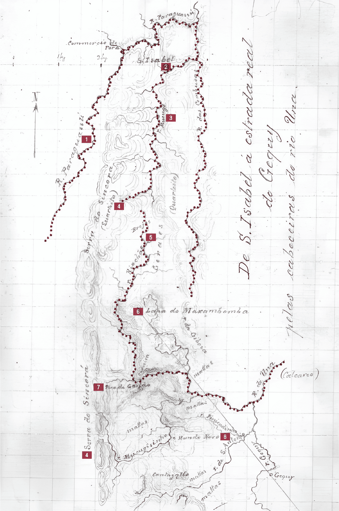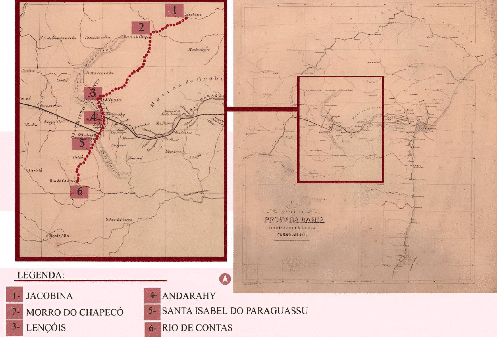 A Figura 6 destaca o provável traçado da estrada real que percorria o Rio Paraguaçu e seus afluentes, demonstrando a relação histórica entre as estradas e os rios, que viabilizou o desenvolvimento de Jacobina e Rio de Contas. O caminho conecta territórios que na contemporaneidade são cidades que fazem parte do conjunto da Chapada Diamantina-BA. A linha vermelha apresenta a rota que se inicia no município de Jacobina, em sequência Morro do Chapéu, depois Lençóis, Andaraí (em seguida Iguatú distrito deste município), Santa Isabel do Paraguasu, que na atualidade corresponde a Mucugê, até, enfim, chegar a Rio de Contas.
