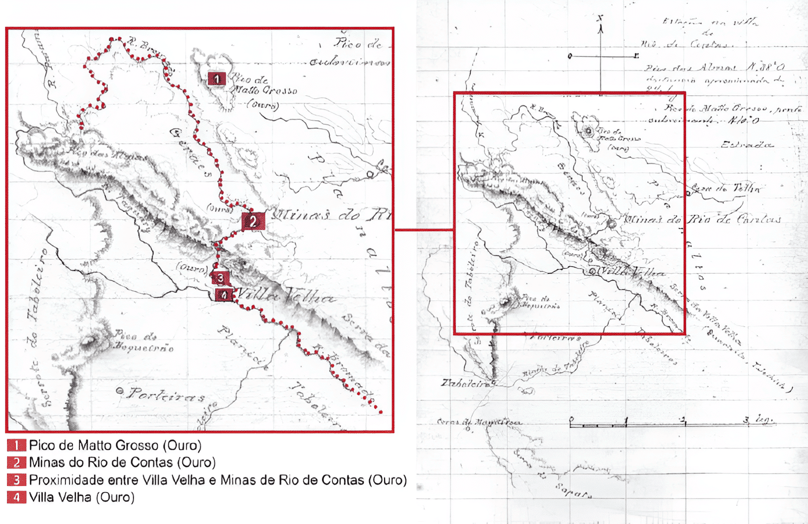 Na Figura 7, apresentamos uma representação cartográfica elaborada por Theodoro Sampaio, em que se visualiza com maior clareza a distância entre a Vila Velha e Minas do Rio de Contas. O desenho também apresenta os rios e o relevo montanhoso, bem como as áreas de exploração aurífera e suas respectivas demarcações, sendo estes: o Pico de Mato Grosso, Minas de Rio de Contas e Vila Velha. Um paredão de montanhas está situado entre os territórios dos dois núcleos urbanos, que conecta o Pico das Almas com a Serra da Villa Velha.