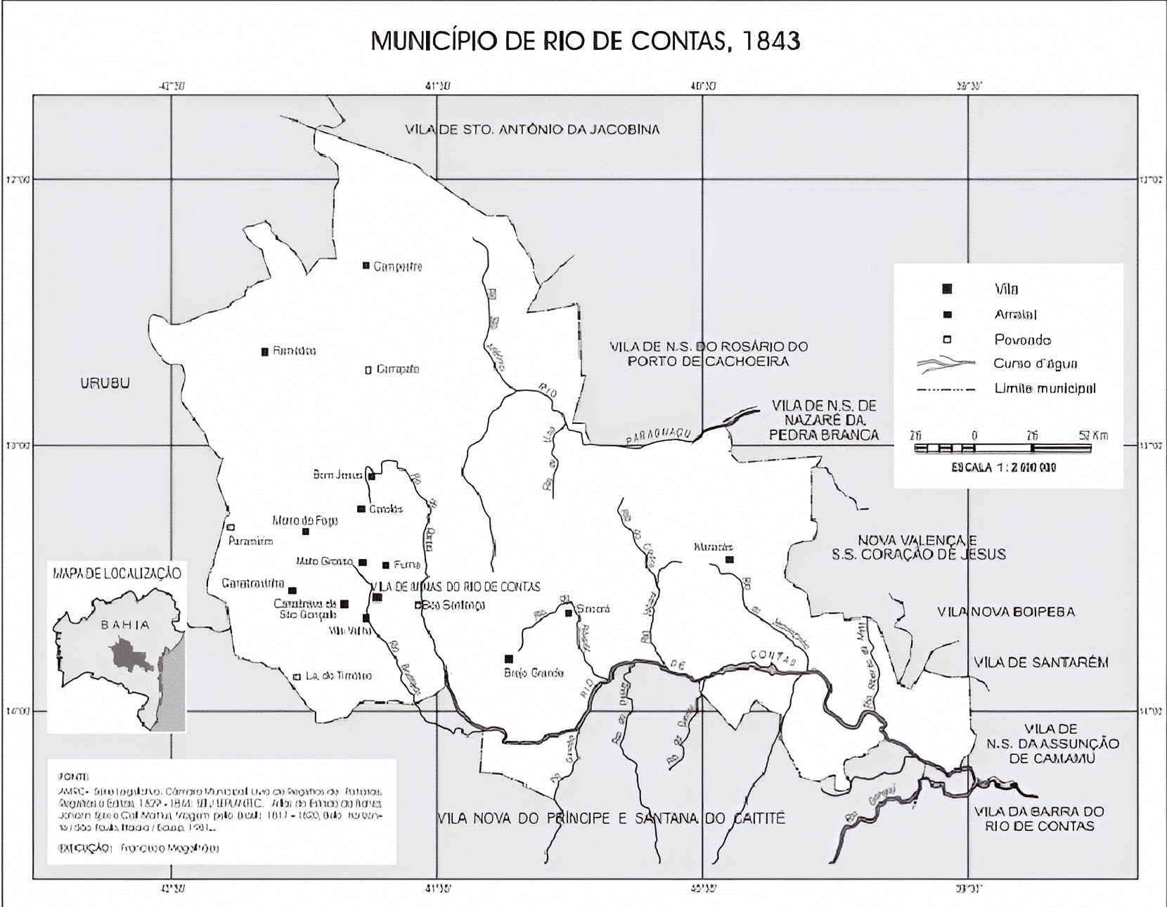 O mapa da Figura 8 permite conhecer o termo da vila de Minas de Rio de Contas e o vasto território sob o seu controle e poder. Fica evidente que o processo de povoamento segue, sobretudo, o curso do Rio de Contas e demais afluentes de sua bacia hidrográfica, do litoral ao interior baiano.