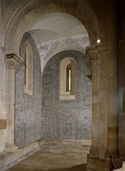 Azulejos de padrão com motivos geométricos e de laçarias, e, mais tarde, também com motivos vegetalistas, aplicados já com um sentido arquitetónico.