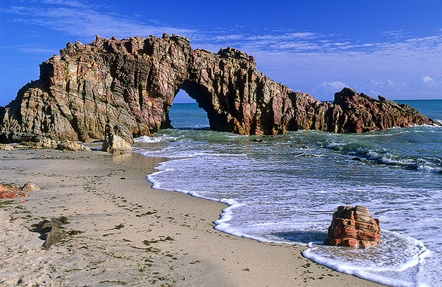 Cartão-postal de Jericoacoara, a Pedra Furada possui uma fenda no meio, sendo na maré baixa o melhor horário para chegar até ela.