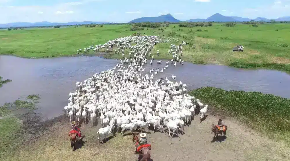 Quando se inicia o período da cheia no Pantanal e a água invade os pastos, os fazendeiros são obrigados a transferir o gado para áreas mais altas, a salvo da inundação.
