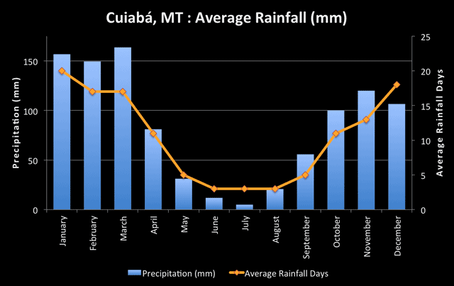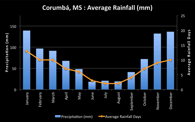 A precipitação anual total na região varia entre 1.000 e 1.250 mm. Isso é, na verdade, menos chuva do que em outros estados vizinhos, o que significa que o Pantanal pode ser tecnicamente classificado como semiárido.