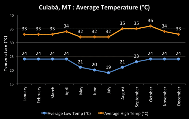 A maior parte da precipitação ocorre nos meses de novembro a março.Nos meses mais frios da estação seca, a temperatura média fica em torno de 24 °C, mas pode sofrer quedas repentinas coincidindo com a chegada de frentes frias de tempestades vindas dos Andes. Isso geralmente ocorre em julho e é conhecido localmente como friagem, com temperaturas que chegam a cair até -1 °C por curtos períodos.