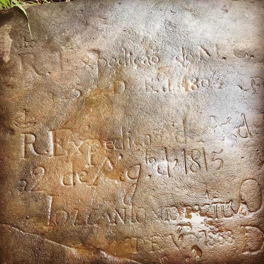 Laje natural à margem esquerda do rio Coxim com inscrições deixadas pelos navegadores das Monções do século XIX, na qual escreviam a data e os nomes de suas expedições da época do Império.